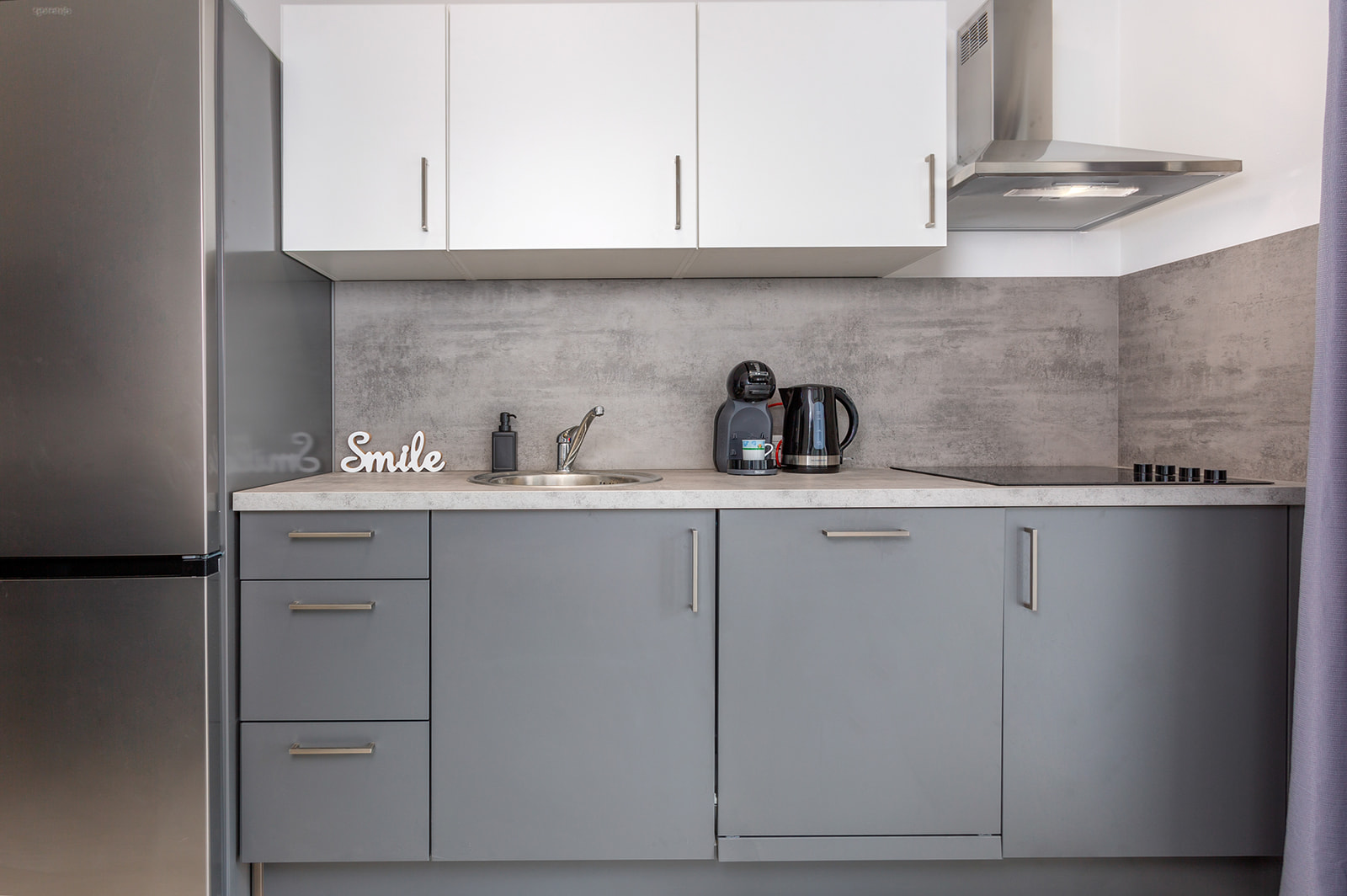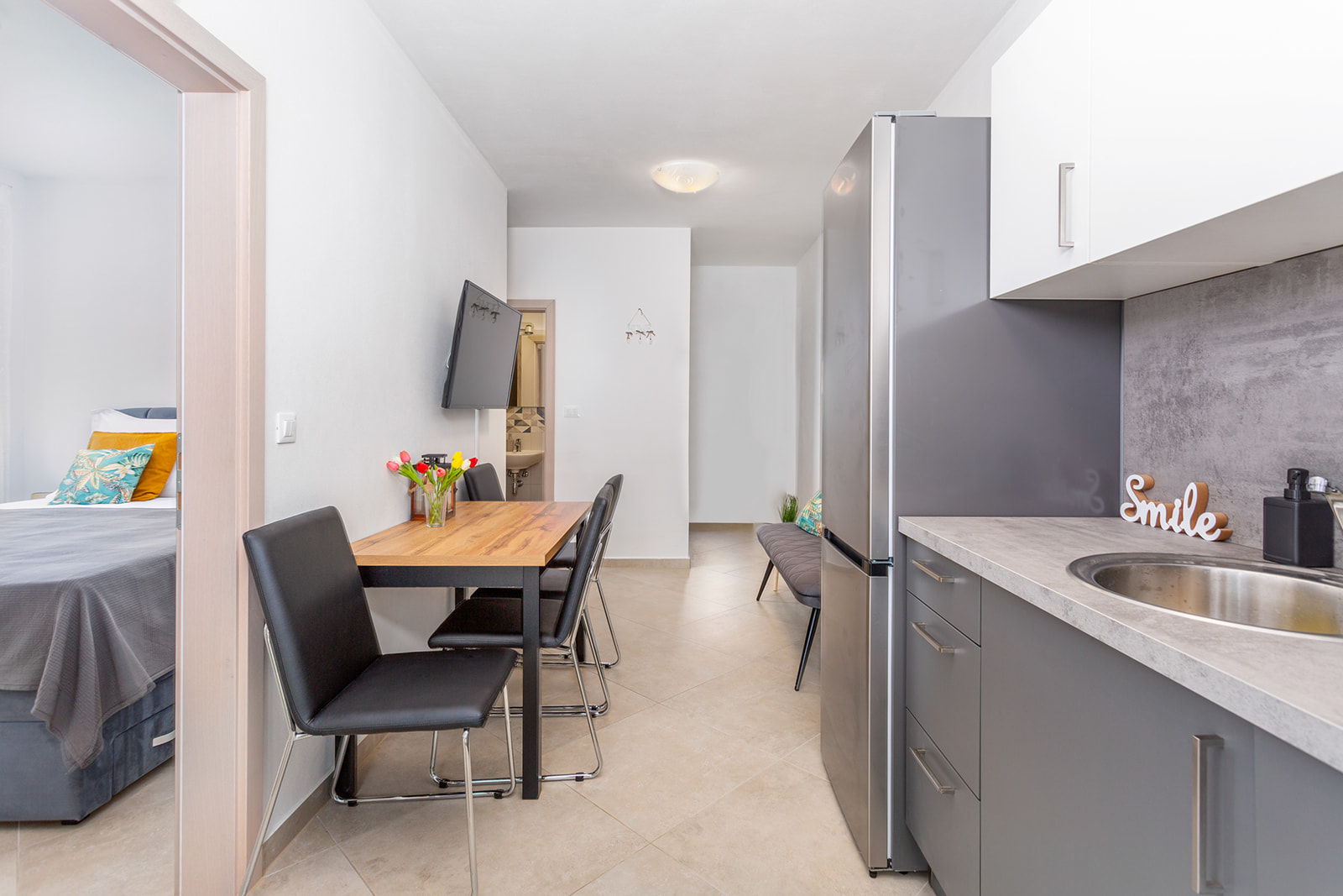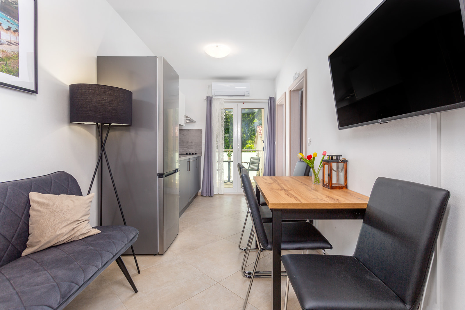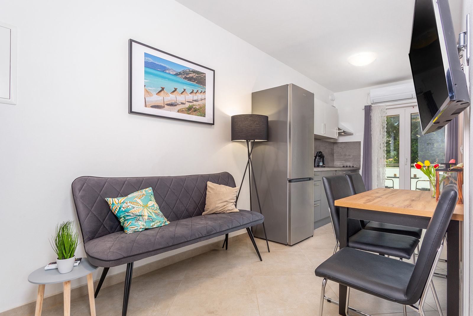 45m2, 2 spavaće sobe – master bedroom sa king size krevetom i soba sa dva kreveta ili bračnim po potrebi. Kupaonica i zasebni wc sa umivaonikom. Potpuno opremljena kuhinja sa blagovaonskim stolom, kaučem i smart TV-om. Izlaz na loggiu.