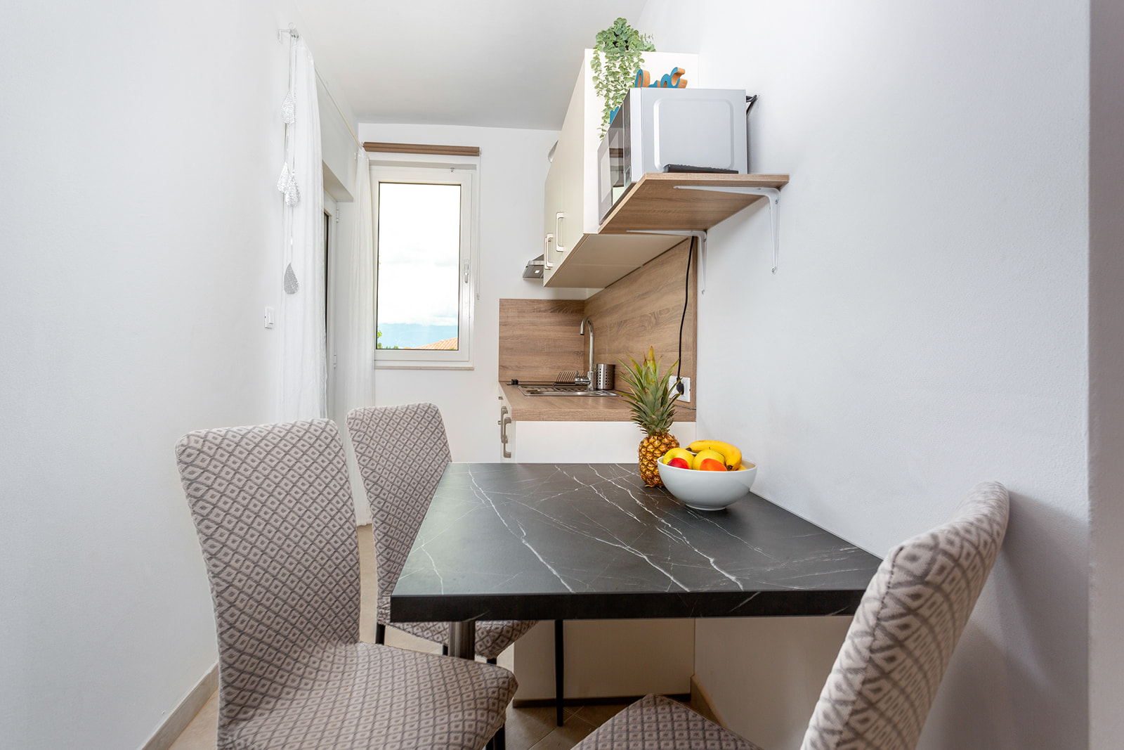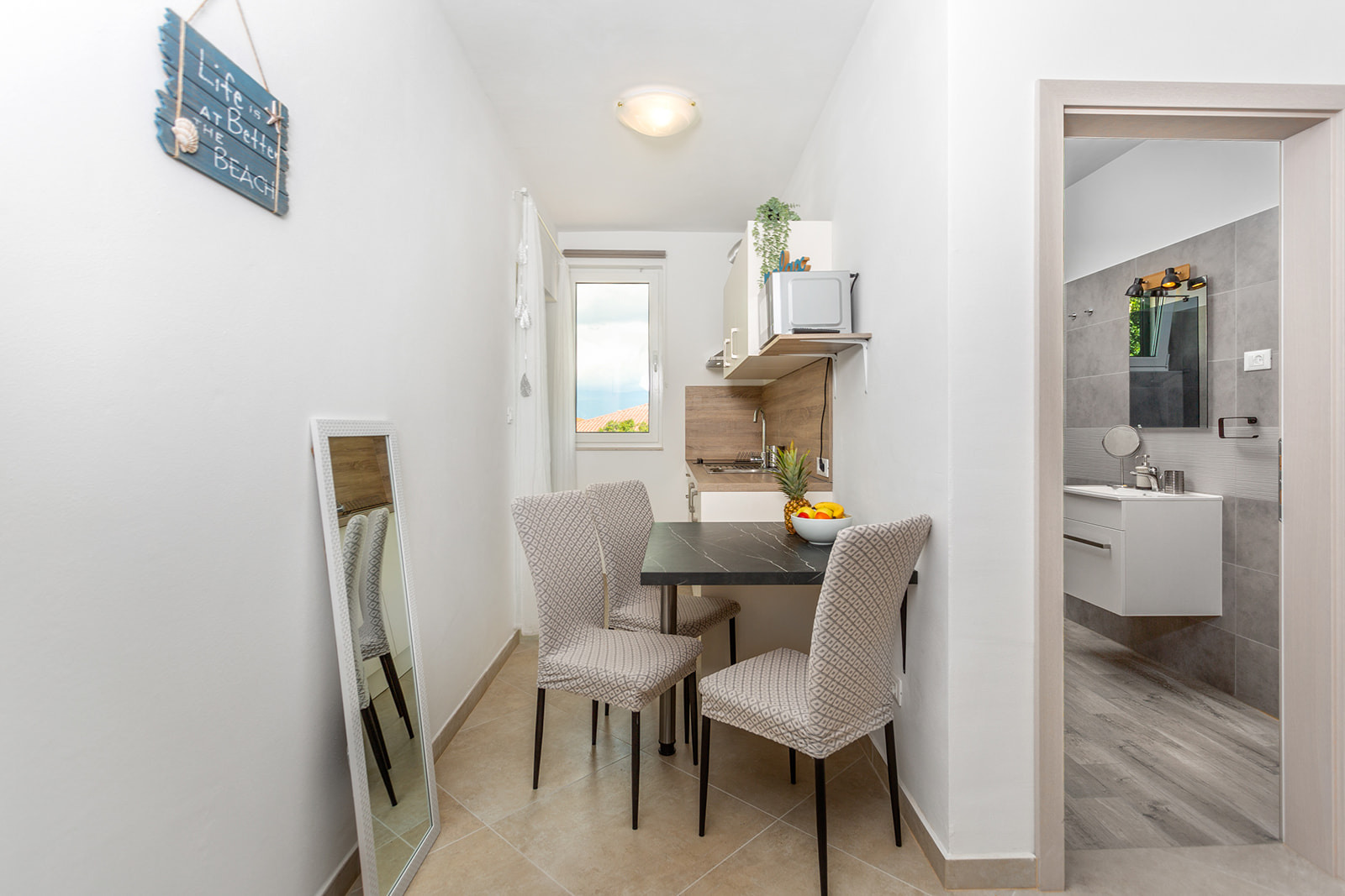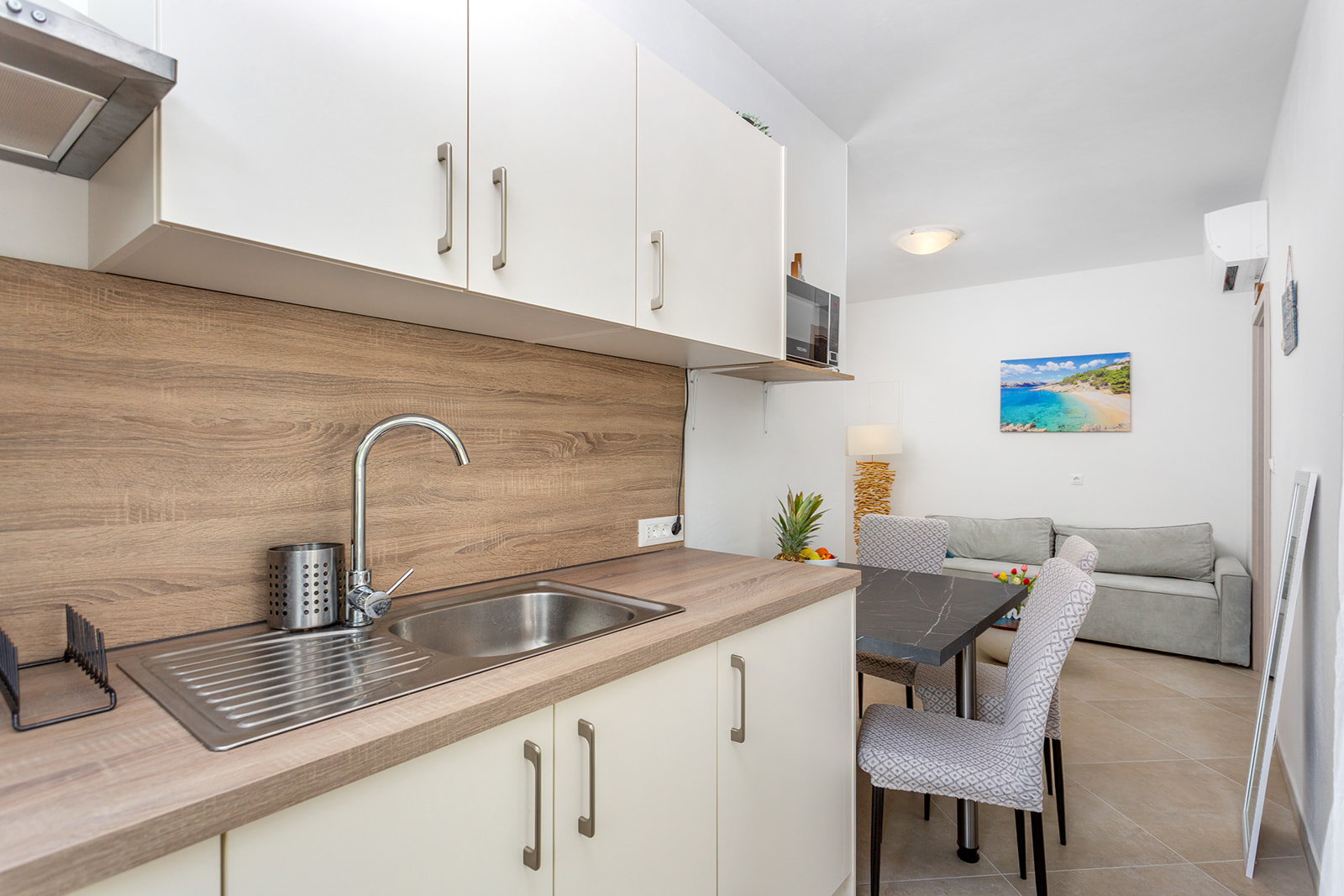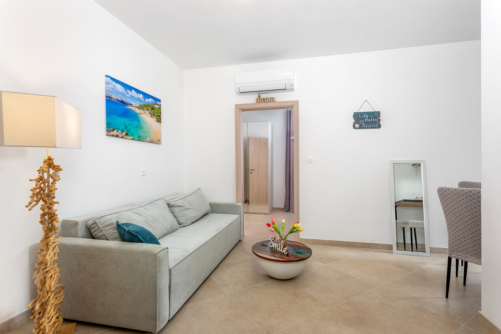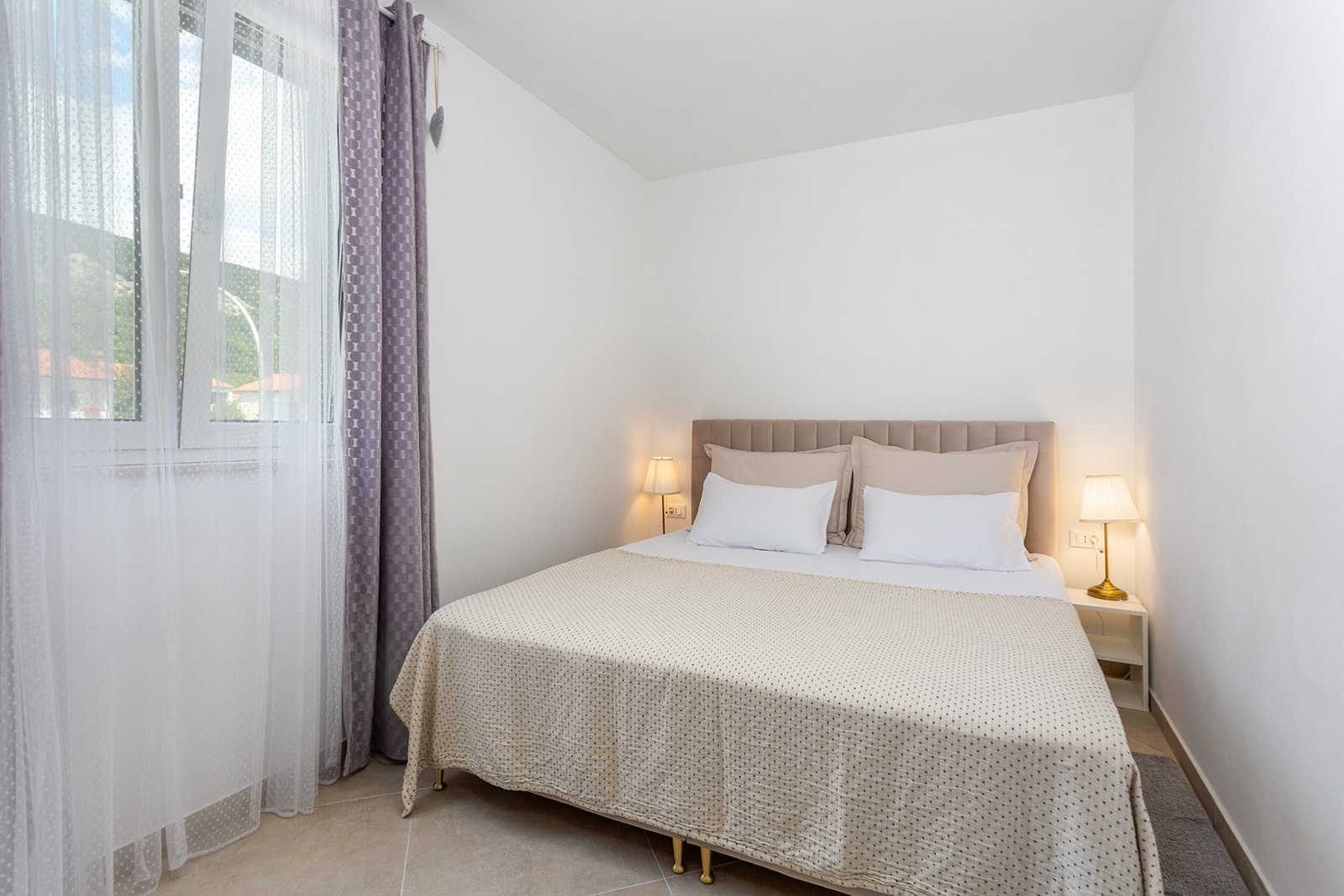36m2, 1 bračna spavaća soba, dnevni boravak sa kaučem na razvlačenje, smart TV. Kupaonica sa walk in tušem, fenom za kosu. Potpuno opremljena kuhinja sa blagovaonom i izlazom na natkrivenu terasu.